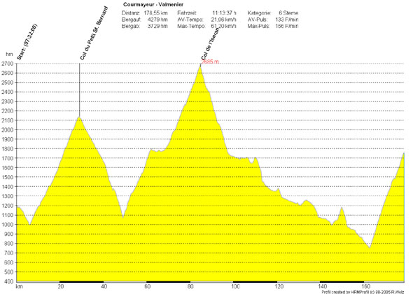 Über diese Etappe mit ihren fast 4300 Höhenmetern braucht man nicht viel zu sagen. Der kleine Sankt Bernhard ist schnell erreicht. Danach wirds happig. Im Anstieg zum höchsten Alpenpass heftiger Gegenwind, 12 Grad und Regen auf der Abfahrt. Die Bergankunft mit ihren 1000 Hm Differnz machen Temperaturen bis 34 Grad im Arc-Tal noch mal schwer.